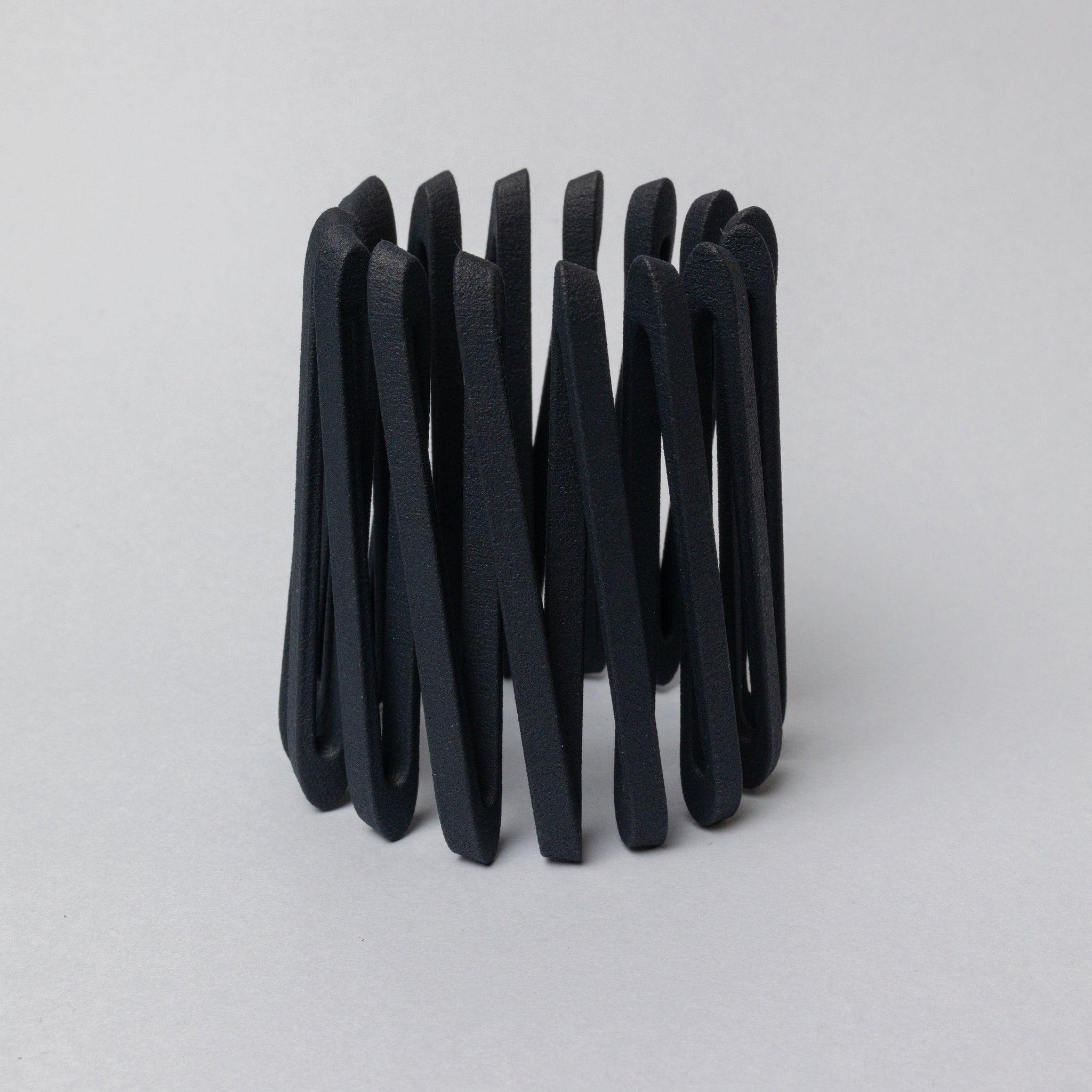 Gioiello realizzato da Maria Jennifer Carew, designer e artigiana friulana che realizza delle vere e proprie opere d’arte, partendo da oggetti o gesti quotidiani. Il bracciale Tape, stampato in 3D, si ispira al movimento elegante e continuo di un nastro che si avvolge attorno al polso. La forma sinuosa e dinamica evoca un gesto leggero e spontaneo, trasformato in oggetto grazie alla precisione della tecnologia additiva. Il nylon, materiale resistente ma sorprendentemente leggero, enfatizza la leggerezza visiva e tattile del design, rendendo il bracciale confortevole e quasi impercettibile da indossare.