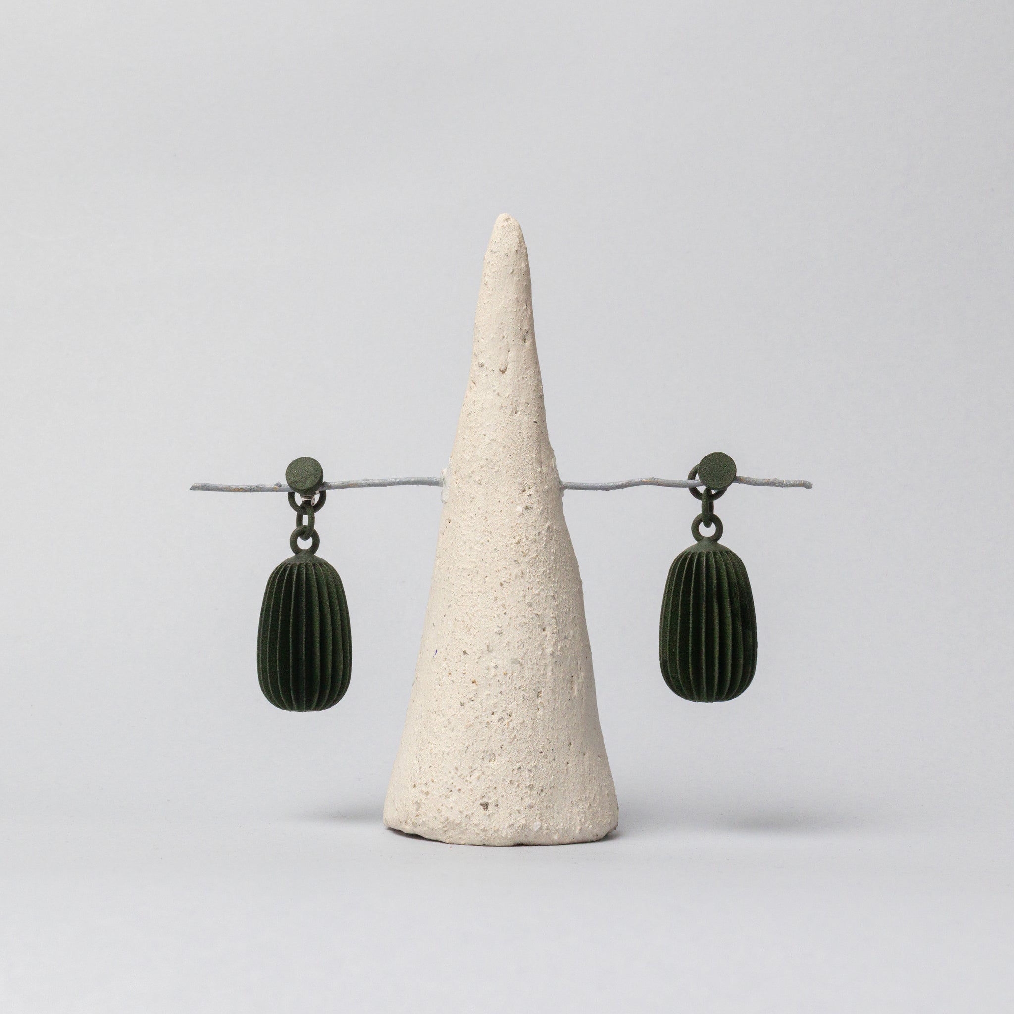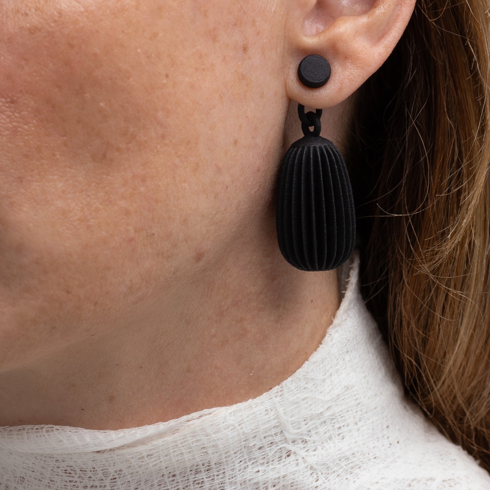 Orecchini stampati in 3D e rifiniti a mano.